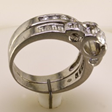 This was a fairly new platinum wedding set. The shank on this ring (the bottom part) was far too thin, and was severely bent when it was brought in. Every diamond was loose, and one was missing (on the left side). Also, the solder used to put the rings together was discolored, and uneven.