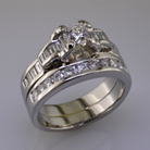This is the restored engagement and wedding ring set. We replaced the paper thin shank on both rings, reset the 2 diamonds that had fallen out, tightened all of the diamonds, re-tipped the prongs on the center diamond, and then re-soldered the rings together. Our client was very happy, and so were we.
