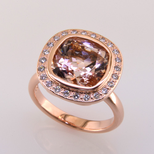 Modern and timeless morganite halo diamond ring, thoughtfully crafted in 14 karat rose gold will light up the room! Set with .24 carat total weight of super sparkly Ideal cut diamonds, and an incredible cushion cut natural morganite gemstone. This morganite and diamond ring has no prongs to worry about, and can be dressed up or down to go with any outfit. A truly spectacular piece, that will never be out of style!