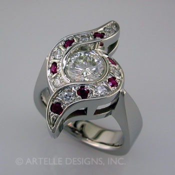 Ladies custom designed diamond and ruby engagement ring. Wed 327b.