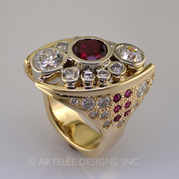 Ladies custom designed diamond and ruby engagement ring. Wed 327b.