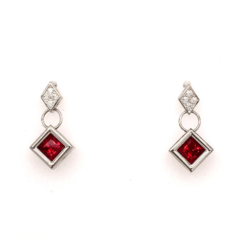 Modern and elegant dangle earrings, created in 14 karat white gold, set with .07ct. T.W. of our super sparkly ideal cut diamonds, and Chatham(r) created square cut rich, ruby gemstones. So special!