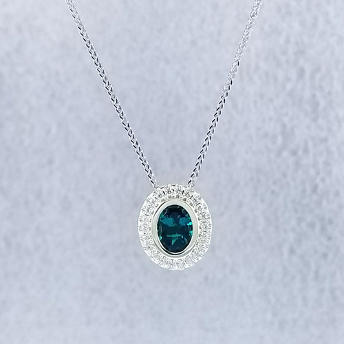 We created this timeless Chatham Created Emerald and diamond halo pendant with a modern flare. There are no prongs to worry about, and our special setting style makes the .17carat of super sparkly, Ideal cut diamonds look like twice the amount. Handmade in 14 karat Green gold, one 1.14 carat oval, bezel set, deep green emerald create enough drama for evening, but not too much for every day wear. Hanging on a .07mm Wheat Chain 18" White Gold, it measures about 1/2" long, and is designed and handcrafted by the artist, Stuart J.