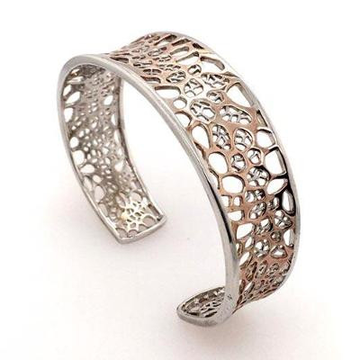 Our silver and rose gold plated cuff with an open weave pattern is fun to wear day or night. This cuff bracelet measures 3/4 inches at the top, and graduates to 1/4 inches at the bottom. LOVE!