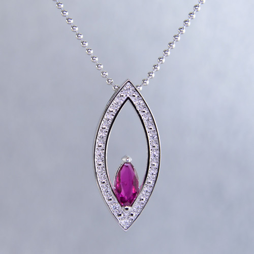 You will be captivated by this timeless,elegant, marquise shaped 14 karat white Gold, marquise ruby and diamond pendant. Framed with .12ct. T.W. of Ideal cut Diamonds, and includes a 1.2mm 14 karat white Gold bead chain, 18 inches long. Pendant measures 1 inch long. Special order only. Please allow 2-3 weeks for delivery.