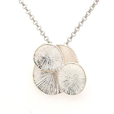 For that down to earth organic girl, this flower pendant is the perfect fit. Created in silver, with four oval shapes blending together to feel like a flower. Nature at it's best! Hangs on a 18" silver wheat chain. Measures 3/4 inch long.